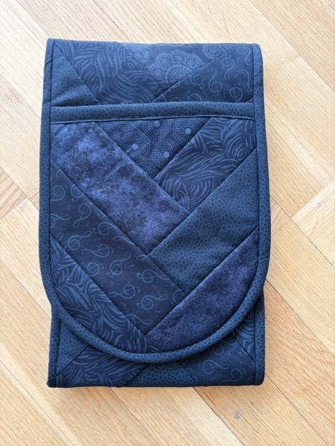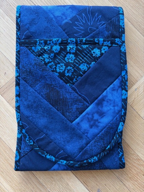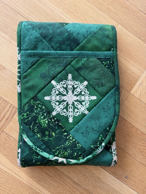 Grytlappen är en tvåhandsfattad grytlapp vilket leder till att när man tar ut t ex ugnsplåten så har man skydd från ena sidan till den andra. Jag har även lagt grytlappsfoder på ovansidan vilket gör att man minskar möjligheten att bränna sig på ovansidan av handen.